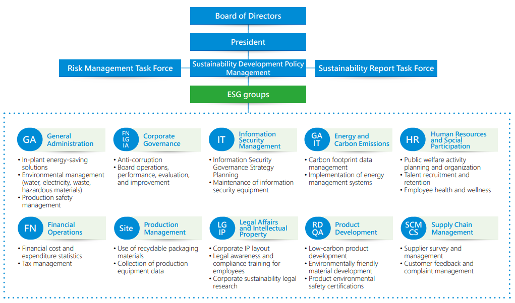 - ESG Task Force: Chaired by the President, integrating cross-departmental members from Finance, Accounting, Legal, Intellectual Property, Audit, Human Resources, General Affairs, Sales, Quality Assurance, Information Technology, and R&D. The Task Force identifies material sustainability issues in accordance with international standards (GRI, SASB, TCFD) and stakeholder engagement outcomes, formulates management guidelines, and ensures continuous improvement.