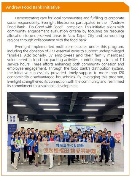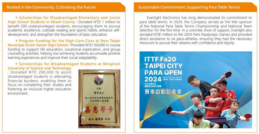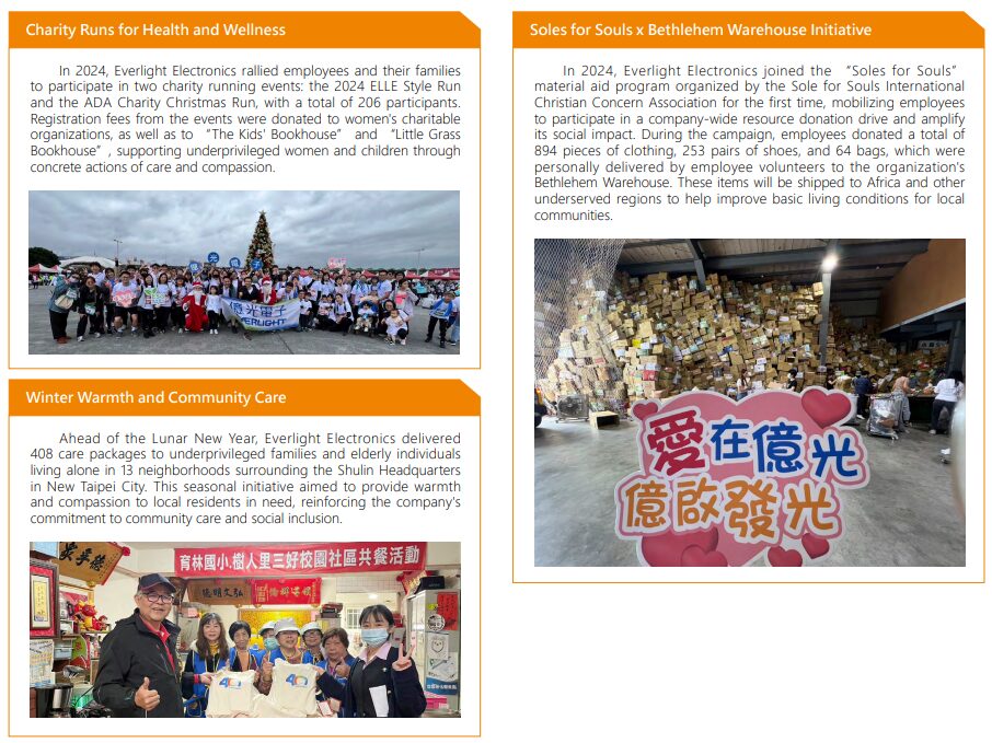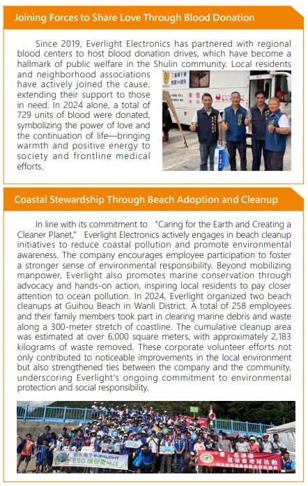 In line with the spirit of “giving back to society,” Everlight Electronics is committed to fulfilling its corporate social responsibilities and upholding a humancentered, benevolent philosophy. The Company regularly organizes charitable activities such as beach cleanups and charity runs to give back to the community and encourages employees to actively participate in various social welfare initiatives.