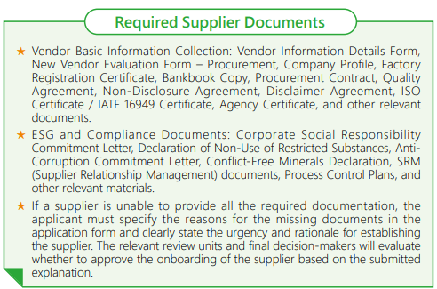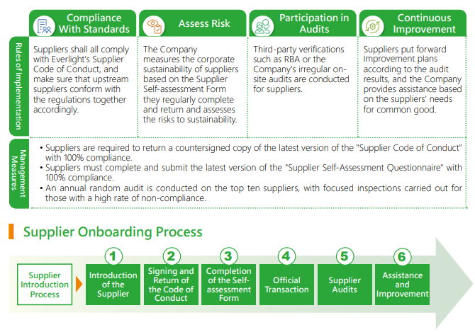 All suppliers are required to sign a set of documents committing to ESG principles. Additionally, Everlight conducts periodic on-site audits of existing suppliers to verify compliance and identify areas for improvement.