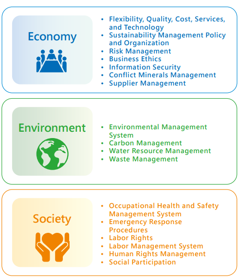 Everlight evaluates potential environmental and social risks of its key suppliers by considering factors such as the supplier’s geographic location, production processes, and audit results based on the Responsible Business Alliance (RBA) Code of Conduct and the SA8000 international social accountability standard. The categories and key risk indicators are assessed accordingly, as illustrated in the chart below: