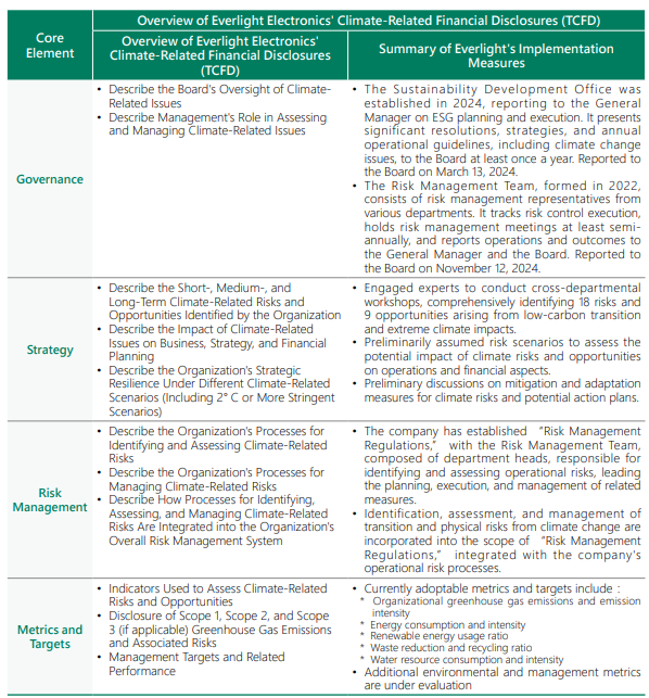 Amid intensifying global warming and the increasing frequency of extreme weather events, all enterprises face unprecedented challenges and opportunities. Stakeholders are placing greater emphasis on the effectiveness and transparency of corporate climate strategies and actions. Everlight closely monitors global climate change trends and international response directions. In doing so, the company adopts the framework recommended by the Task Force on Climate-related Financial Disclosures (TCFD), established by the Financial Stability Board (FSB), to assess the risks and opportunities associated with climate change. Through this framework, Everlight evaluates potential adaptation and mitigation measures, as well as their financial impacts. The company is actively planning to enhance the clarity and completeness of its disclosures in the near future, in order to gain the full support of customers, investors, and publicsector stakeholders for its climate strategy initiatives.