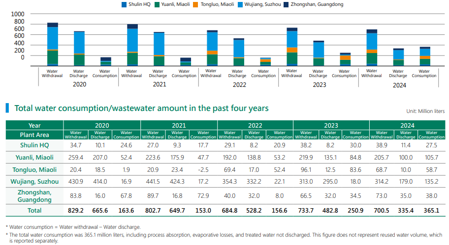The primary sources of water include industrial tap water and local municipal supply systems, and none of Everlight’s sites are located in water-stressed areas. To strengthen water resource management, each operating site has implemented several key measures, including improved water-saving designs in production processes, leak detection and control in pipeline systems, and the optimization of cooling and cleaning procedures to reduce non-essential water use. In addition, the Company continues to promote water-saving behavior through employee education and awareness programs to enhance day-to-day water use efficiency. Notably, in 2024, the Wujiang Suzhou Plant significantly reduced its wastewater discharge by introducing a recycling system for process wastewater, allowing treated water to be reused within operations.
